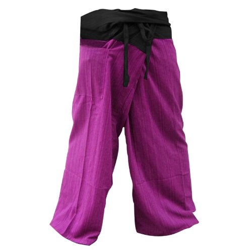 Thai Fisherman Pants have a very wide waist with a belt that ties from the rear. Simply step into the pants, pull the waist out to one side wrap the extra fabric around to the front and tie the belt. Length can be adjusted by folding over the top of the pants!