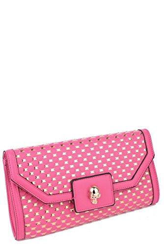 Shiny Braided Clutch Bag With Skull Detail. Work your look with this trendy shiny print clutch! This clutch will be a perfect addition to your evening outfit, however mixed with neutral accessories and flats it can be suitable for any day event as well. Key features include detachable strap, metal magnetic fastening and golden 3D skull design.